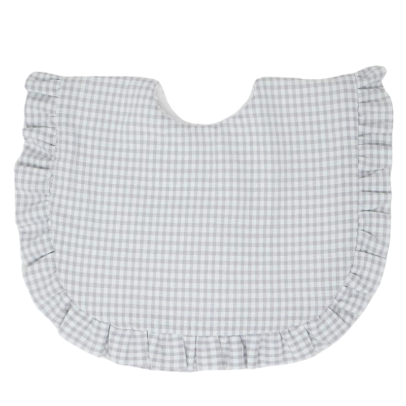 BABERO CHIP COLECCIÓN VICHY GRISEl babero Chip es ideal para acompañar al bebé en sus primeras papillas, combinando estilo y funcionalidad. Confeccionado en 100% algodón, su reverso de rizo absorbe y protege, mientras que el encantador volante que rodea el borde le da un toque especial.Este babero se ajusta cómodamente con lazos en la parte trasera y, además, puede personalizarse para hacerlo aún más único y especial. Una elección perfecta para los momentos de alimentación, que asegura comodidad y estilo.